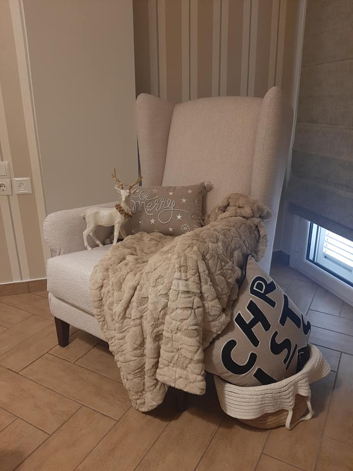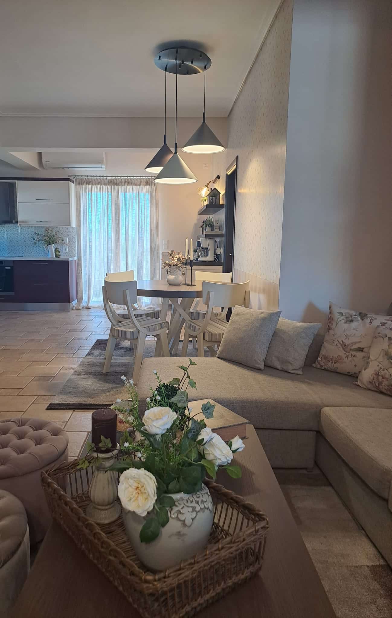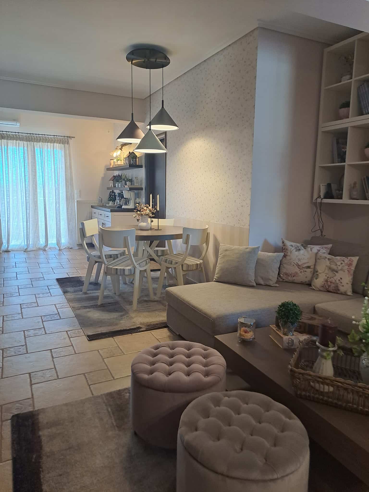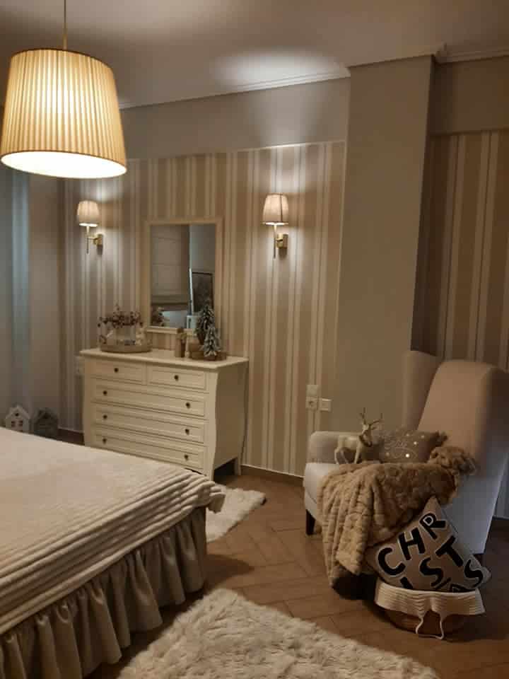 Η ανακαίνιση μεταμόρφωσε το σπίτι σε ένα καταφύγιο άνεσης και κομψότητας. Ταπετσαρίες με απαλά σχέδια και χρώματα δημιούργησαν μια ζεστή ατμόσφαιρα, ενώ τα νέα έπιπλα, κατασκευασμένα ειδικά για τον χώρο, προσφέρουν απόλυτη χαλάρωση. Οι πολυθρόνες, ντυμένες με υφάσματα υψηλής ποιότητας, και οι κομψές κουρτίνες ολοκλήρωσαν την εικόνα ενός χώρου που συνδυάζει αισθητική και λειτουργικότητα.