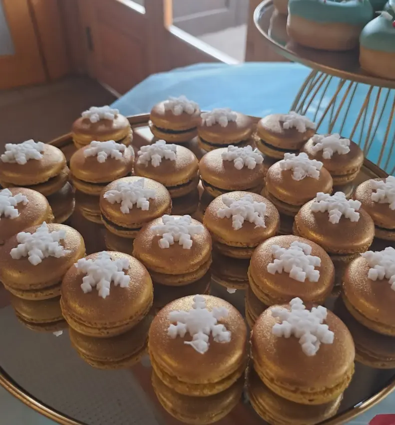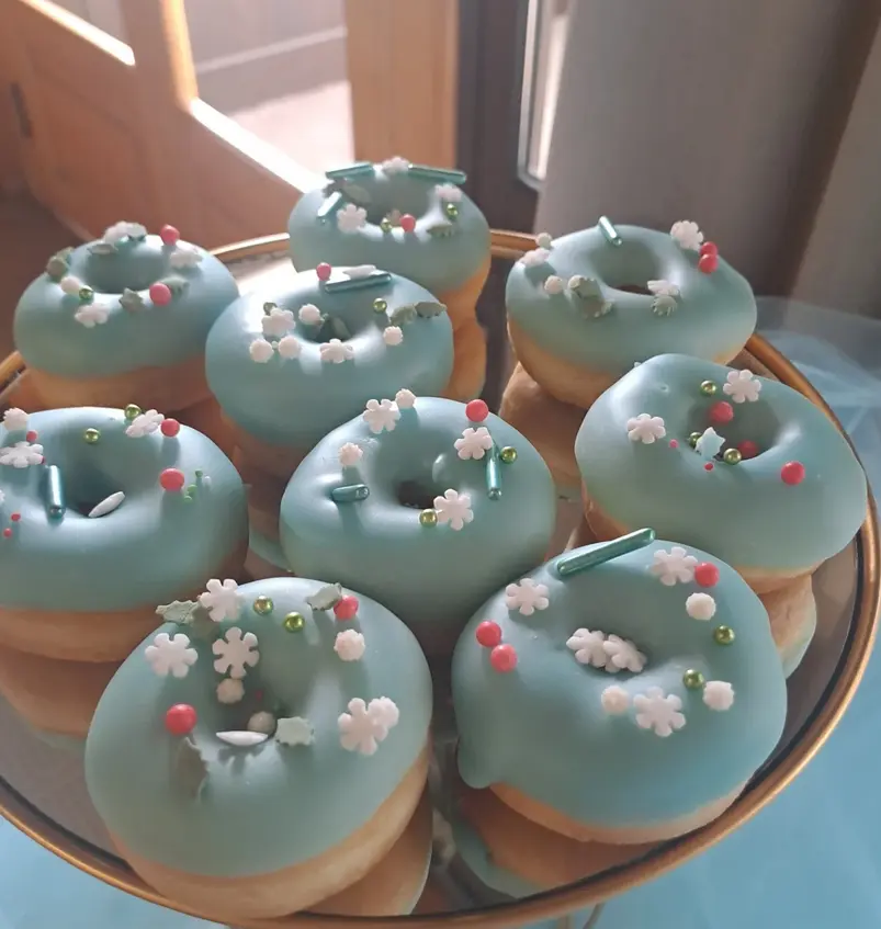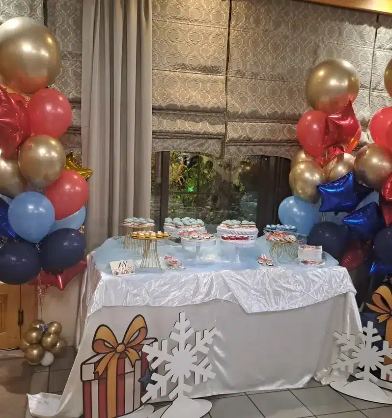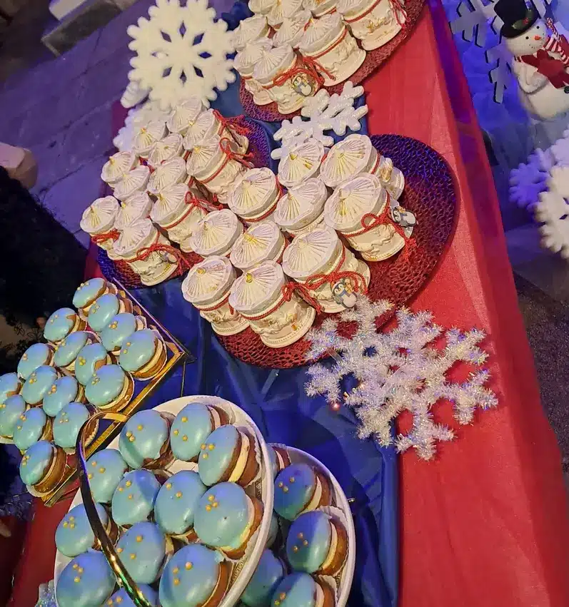 Στον χώρο της δεξίωσης, το θέμα των Χριστουγέννων μπορεί να αναδειχθεί ακόμα περισσότερο. Ένα candy bar διακοσμημένο με χριστουγεννιάτικα μπισκότα, cupcakes με σχέδια νιφάδων ή ταρανδάκια και ζεστή σοκολάτα σε όμορφα ποτήρια δημιουργεί μια ζεστή και φιλόξενη ατμόσφαιρα. Τα τραπέζια μπορούν να στολιστούν με μικρά δεντράκια, κεράκια, γιρλάντες και καρτελάκια με το όνομα του παιδιού και την ημερομηνία της βάπτισης.